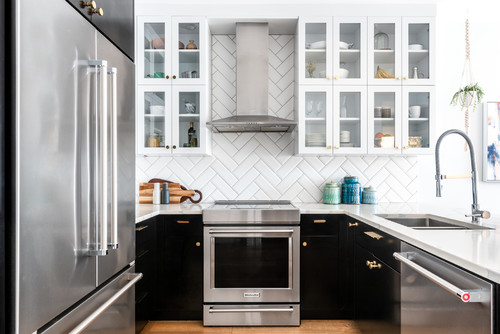 Generally speaking, for a small kitchen like this, the simpler the design, the more crisp and clean it will be. And here, different colors, textures, and patterns give the kitchen a hip look. Multiple small glass-front cabinets bring storage space and convenience to the kitchen. A white beveled herringbone tile backsplash emphasizes the position of the glass-fronted cabinet due to the thickness of the finish, creating a layered look. Black flat-panel kitchen cabinets with brass pulls lend a luxurious atmosphere to the kitchen.