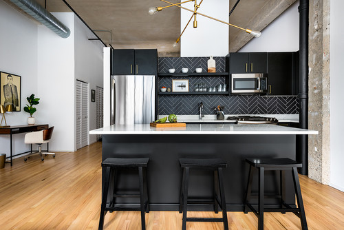 Industrial Kitchen with Black Island and Herringbone Backsplashes