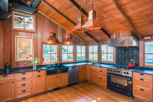A Chic Look with Black Backsplashes and Brown Floorboard In Rustic Kitchen