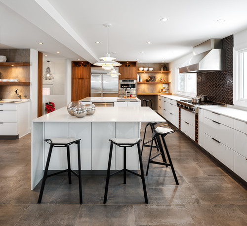 The classic black and white combination can be found in many modern kitchens. This is no exception. The rich color of the matte herringbone backsplash has a modern feel, and unlike usual, the pattern is not quite obvious, creating a hazy illusion. The white flat-panel kitchen cabinet also forms a sharp contrast with it, creating a clean and simple feeling. Solid black pulls add color to the cabinet finish.