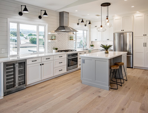 Thanks to the high ceiling, this kitchen creates a sense of spaciousness. And the addition of sorghum planks adds color to the kitchen. In this kitchen, the white color scheme dominates, and simple accents of black knobs contrast the cabinet finishes. Meanwhile, a black herringbone backsplash adds a much-welcomed chic touch to this kitchen. The white glass-front cabinet is integrated with it, giving it a more simple and beautiful appearance. Light wood floors bring a bright effect to the kitchen with their clean look.