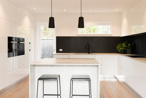 White Kitchen with Black Herringbone Backsplashes and Cabinet Pulls