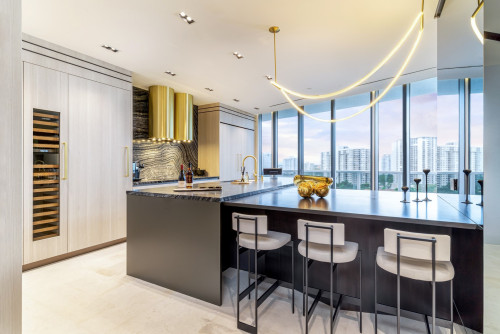 It is worth mentioning that this is an L-shaped kitchen with an L-shaped island. It has a lot of space and an even bigger view. A glance at the high-rise buildings and beautiful scenery outside the window creates a magnificent indoor atmosphere. And that’s not all! The luxurious look of the gold range hood is paired with an intricate black marble backsplash for visual interest. And with the addition of lighting effects, the busy pattern on the backsplash’s finish is quite vivid and lifelike. The chandelier design on the ceiling is even more novel and unique, adding color to the kitchen while also creating a bright effect.