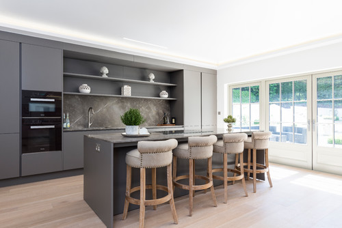The dark grey flat-panel kitchen cabinets have a calm and atmospheric appearance, which establishes a solemn and serious atmosphere for the kitchen. It combines perfectly with the black insert cabinets for a stylish look. Exuding luxury and elegance, black marble is a great material for a backsplash. It is both stylish and traditional and works well in many different kitchen styles. The wall shelf is perfectly combined with it, providing a wide storage space and bringing convenience. The light from the outside makes the entire interior space brighter and more noticeable.