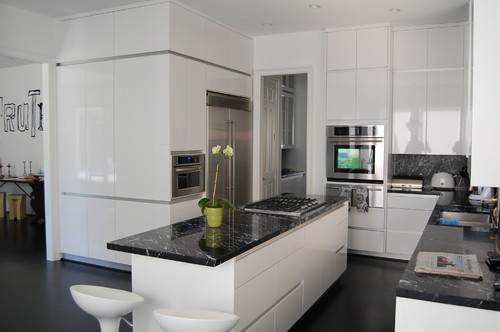 high gloss kitchen with white island and black marble backsplash
