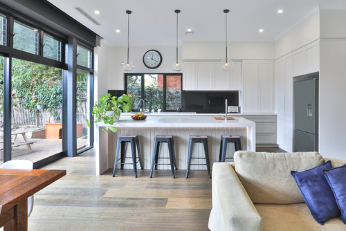 open & airy kitchen with white island and black marble backsplash