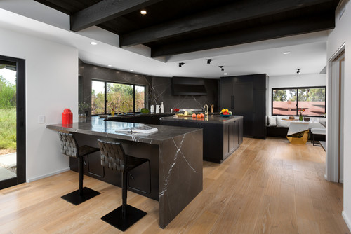 modern kitchen with l-shaped island and black marble countertop