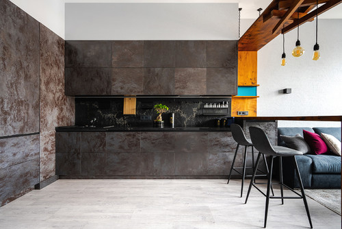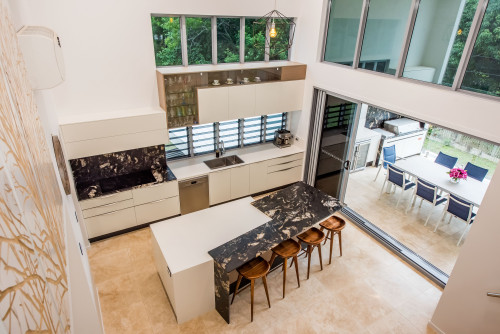 Contemporary Kitchen with porcelain tile flooring and black marble backsplash