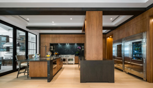 Marble has a low contrast in stone materials and works well with bold cabinets. Here, stunning oak and black flat-panel kitchen cabinets are paired perfectly with the subtle texture of the black marble backsplash. It has to be said that the lines on the marble finishes are like lightning, and the colors are distinct, creating a unique look. What’s more, oak pillars act as a transition, combined with glass wine cabinets, creating a luxurious atmosphere.