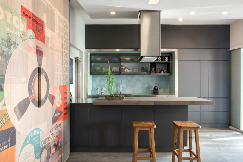 A bold clash of a classic kitchen with character walls! The kitchen is very understated in both color and design. The gray and matte black colors add a touch of nobility and mystery, and the irregular shape of the blue peel and stick backsplash reduces the monotony of black and balances the colors. Concrete floors, solid surface countertops, and stainless steel hoods all complement each other. The personalized walls are striking and make this kitchen eclectic.