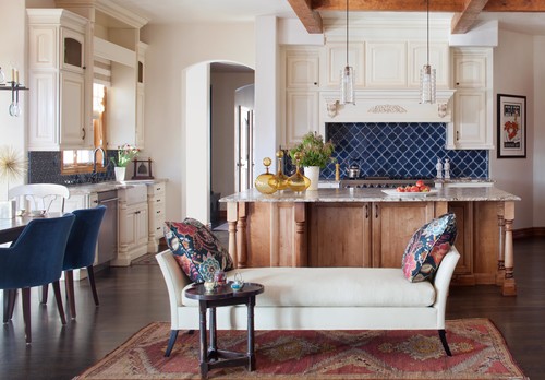 In this traditional beige kitchen, the blue peel and stick backsplash is very attractive. The interlocking horizontal design contrasts with the minimalist design of the shaker above, which makes the kitchen very stylish and impressive. The purposely aged wood center island adds an antique touch. The whole kitchen is very layered and the arrangement between the elements is well organized and does not look cluttered. Sufficient in natural light, comfortable sofas let the kitchen become very comfortable and cozy.