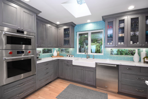 How about gray and sky blue together? Take a look at this kitchen. The blue peel and stick backsplash is a brick design with white grout that accentuates the shape of the brick. The sky blue color stands out in this gray kitchen, giving a visual highlight and making the kitchen less monotonous. The stainless steel kitchen appliances are perfectly set into the cabinets, seamlessly joining to form a perfect look. Glass upper cabinets and skylights fill the kitchen with natural light.