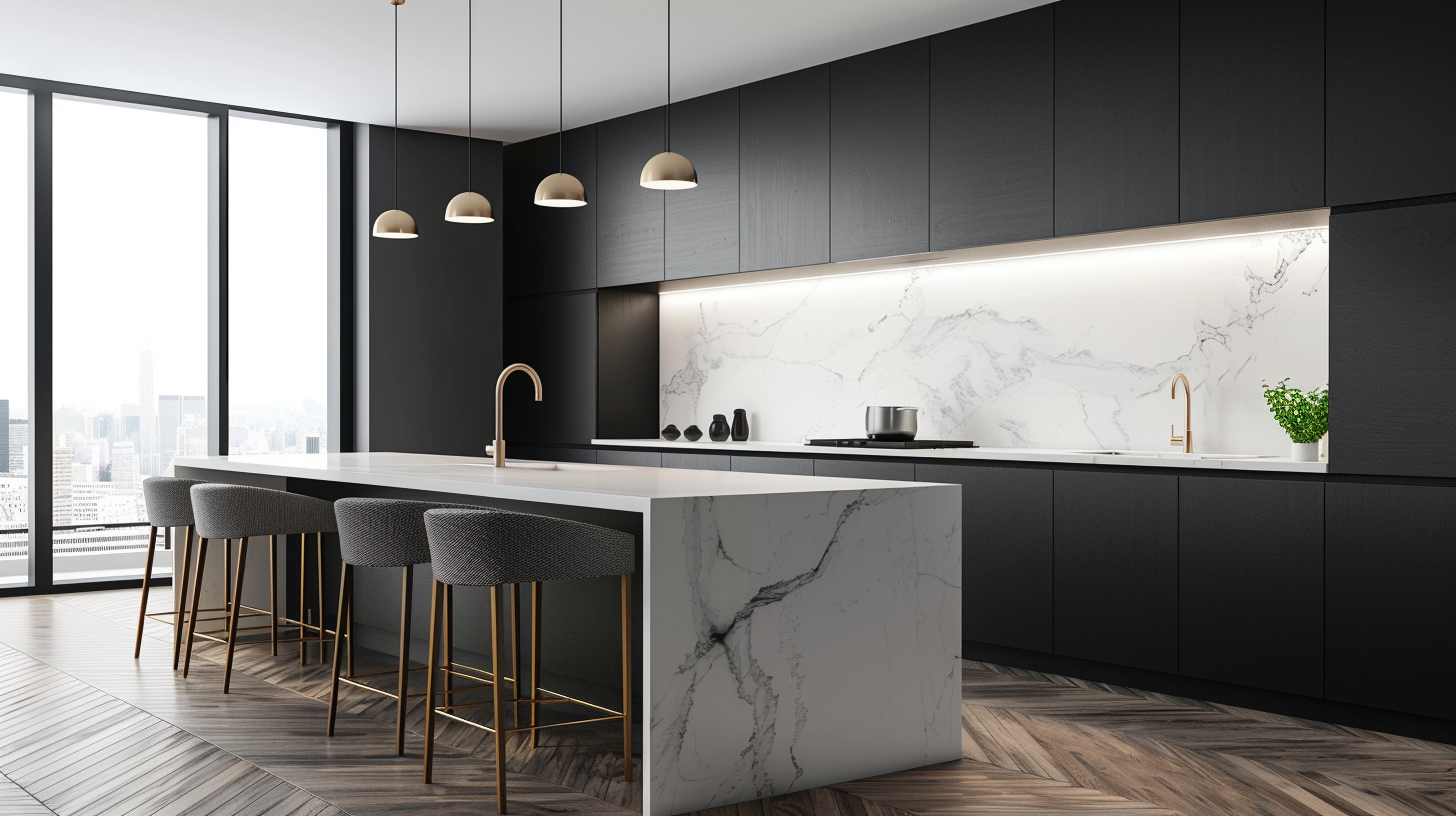 Modern black matte open kitchen with marble countertop