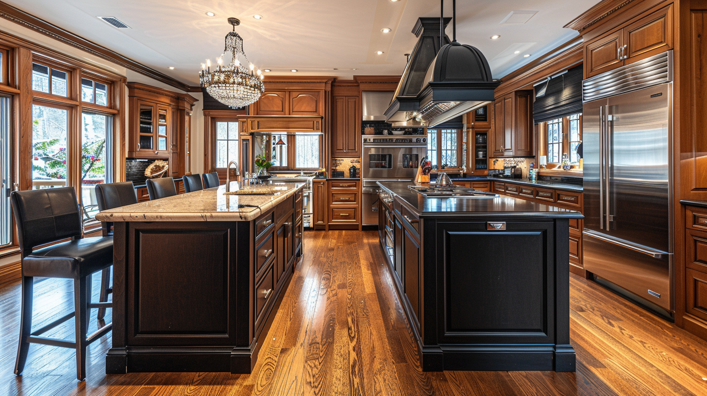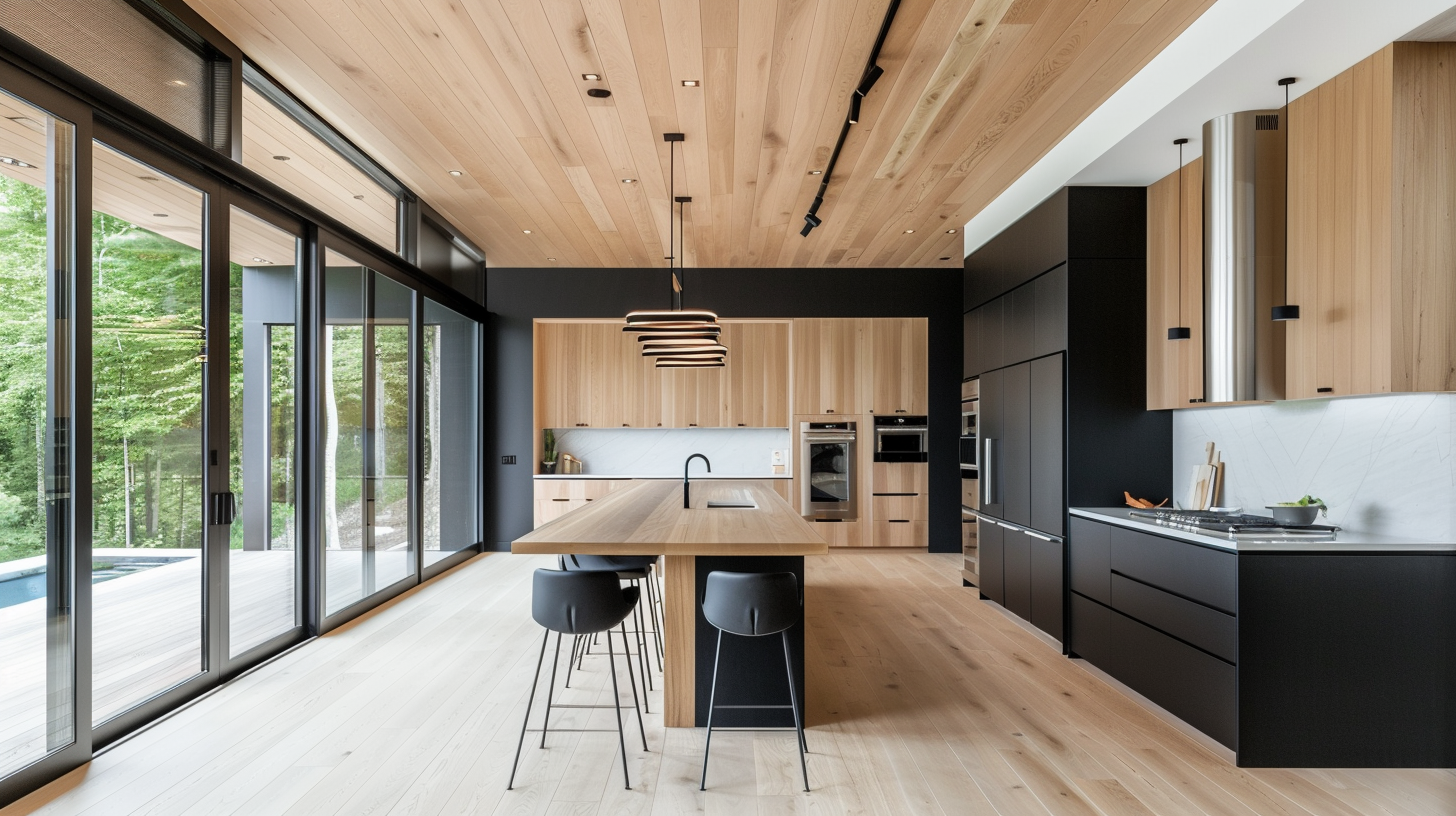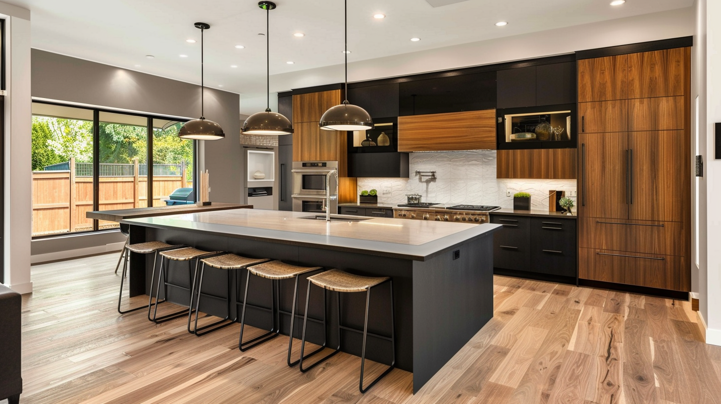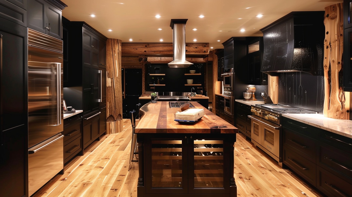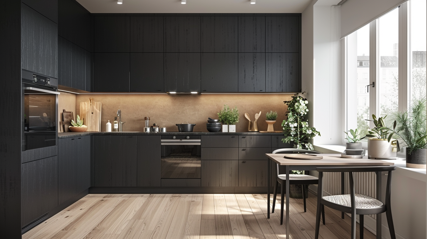 Two-tone brown and matte black kitchen with solid wood flooring