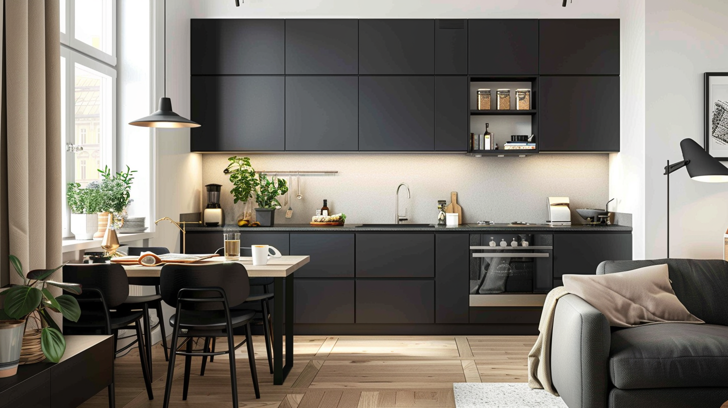 An elegant combination of a small matte black kitchen and living room