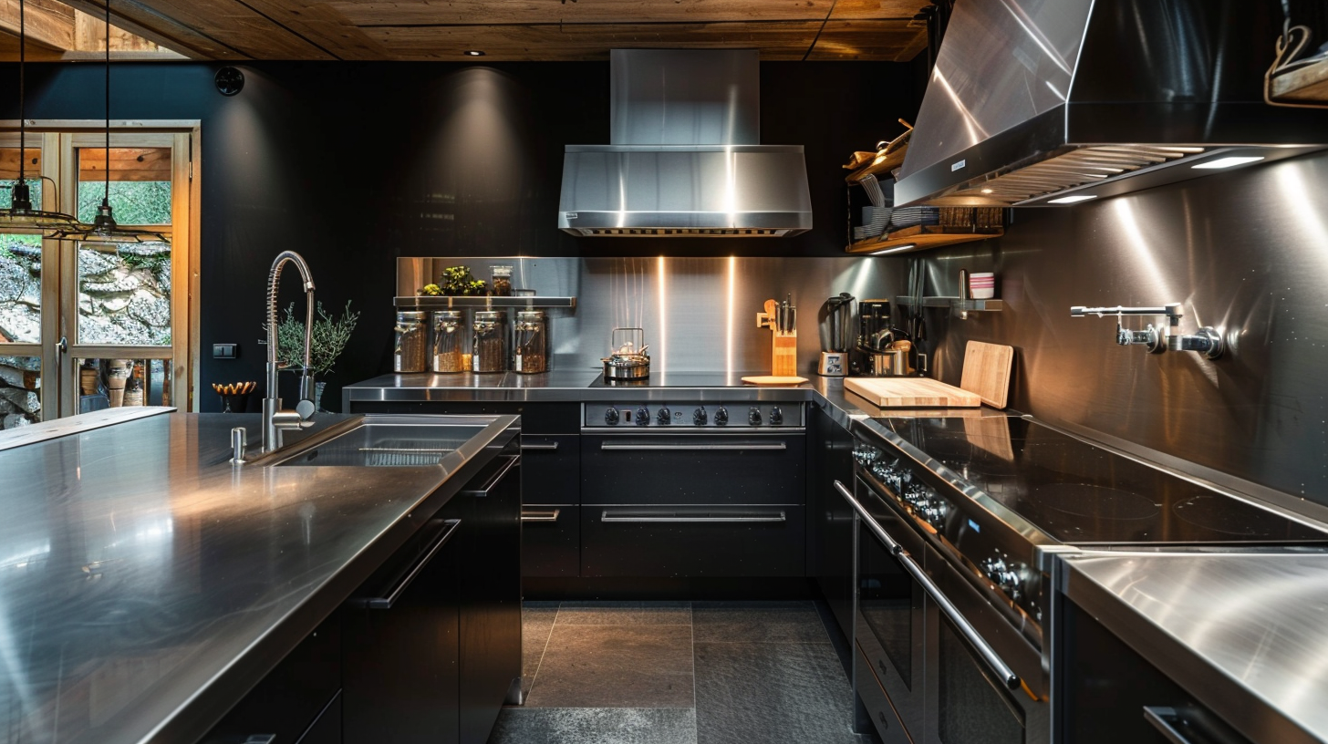 Stainless steel can create a country-style kitchen! The stainless steel countertop has an attractive shine that stands out in this kitchen, and the backsplash and hood are also made of metal for a very continuous and uniform look. The black color in this kitchen does not look depressing, but rather is illuminated by the warm LED light strip, which is very high class and adds a touch of warmth. The slate flooring adds an authentic feel and is very stylish.