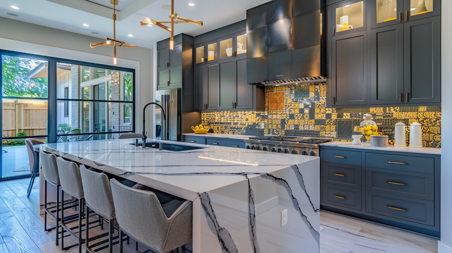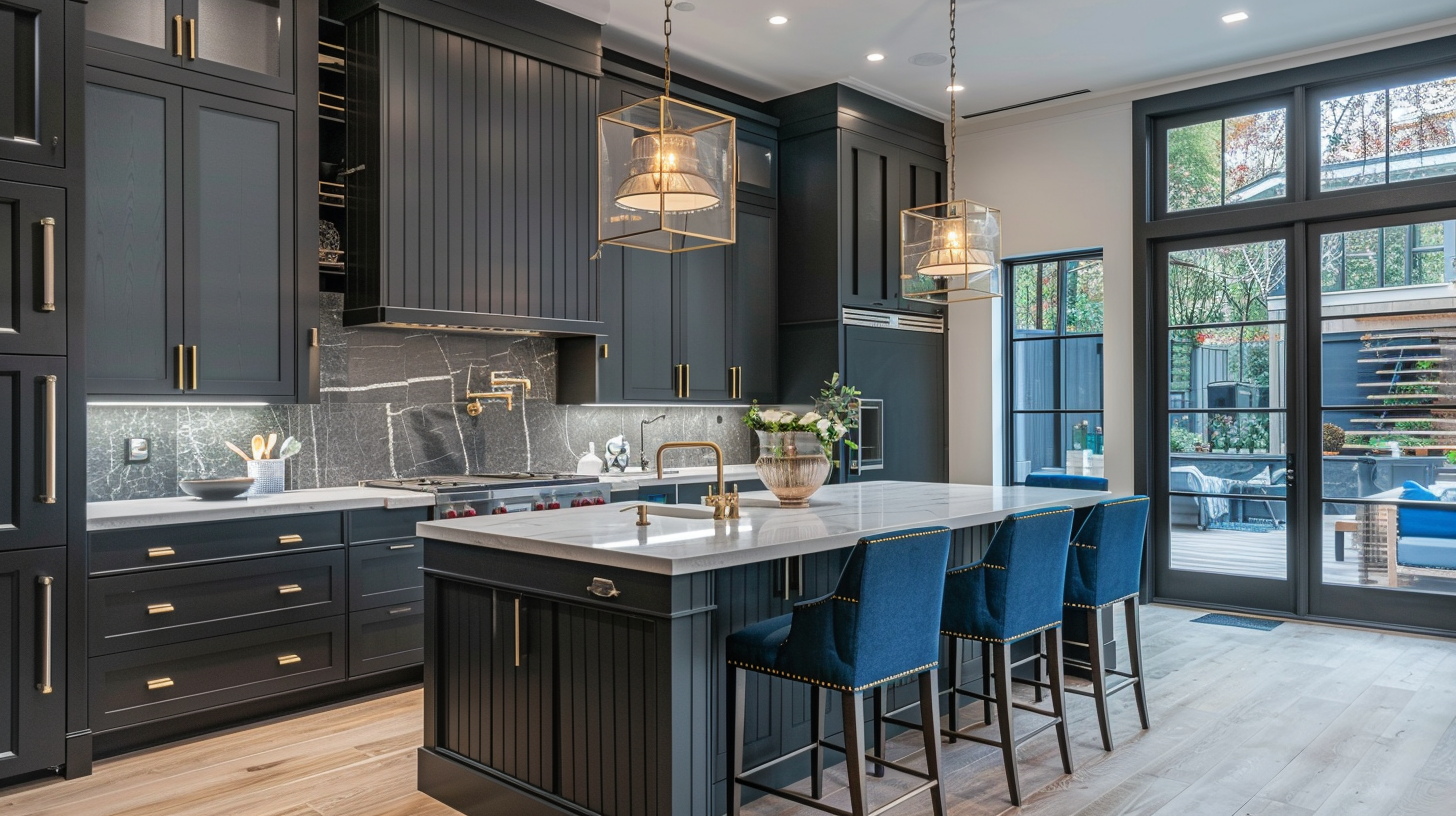 In this L-shaped open kitchen, everything is stylish. The gray slate backsplash has a unique pattern that is very special. A bar pendant light lights up the whole kitchen and stands out very much in the kitchen. The beadboard cabinets extend upward to give the whole kitchen a more stylish and spacious feel. The contrast between the white countertops and the black cabinets gives the entire kitchen a balanced aesthetic. The dark blue chairs serve as a great accent, adding a highlight to the kitchen and drawing the eye.