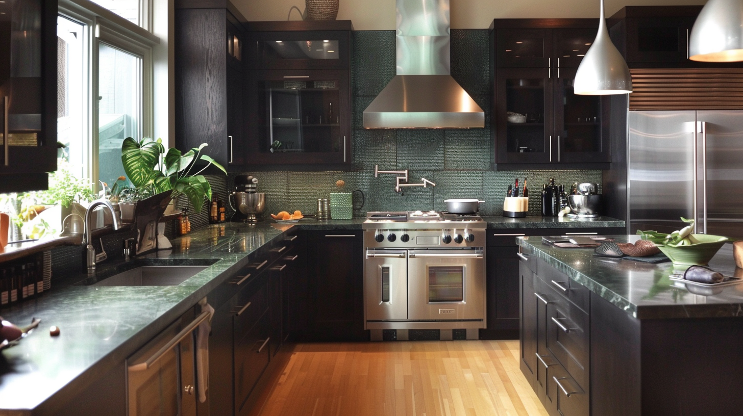Green backsplash brings life to a black kitchen
