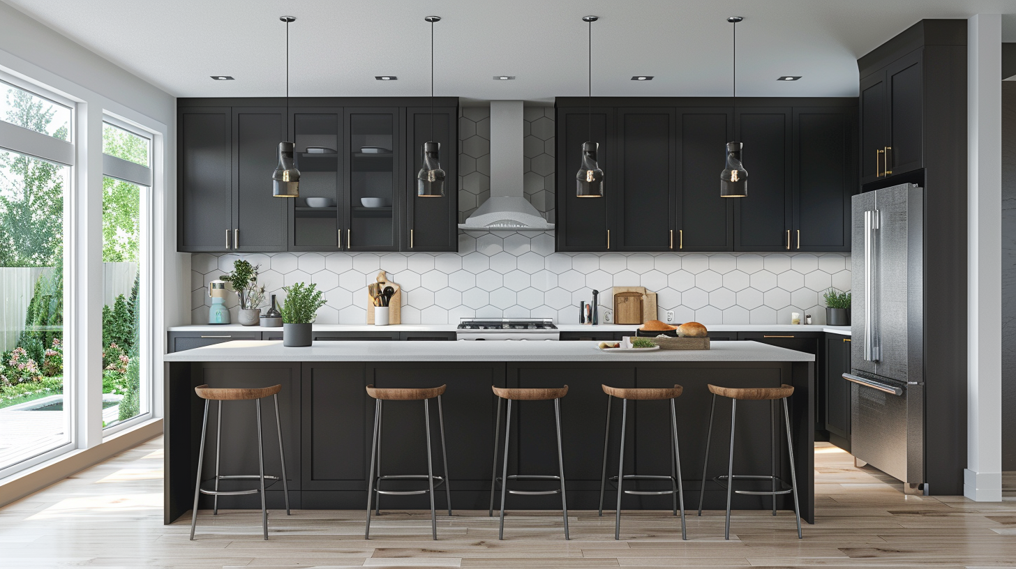 Black modern kitchen with hexagonal tile backsplash