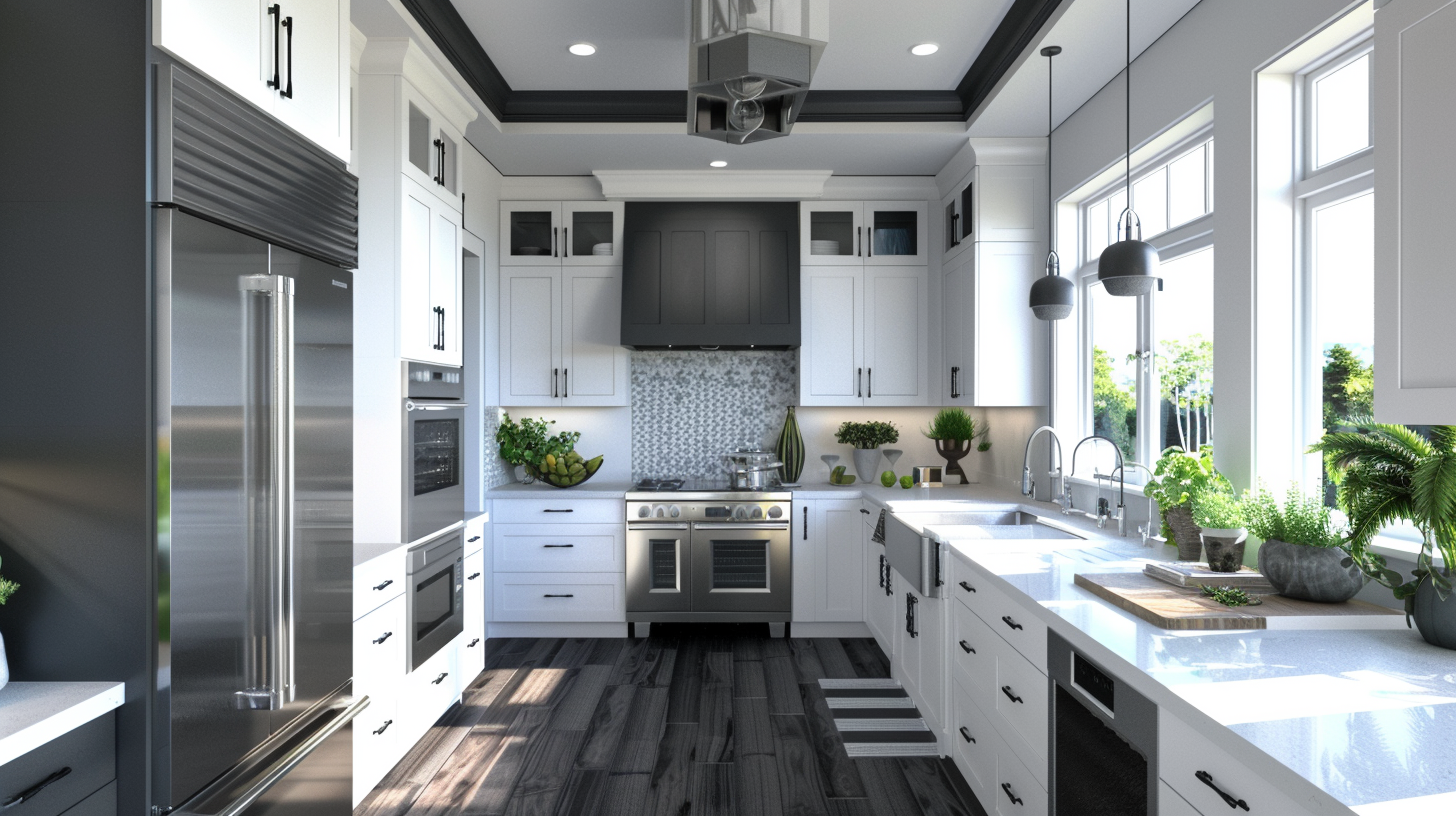 Black, white and gray classic modern kitchen with dark hardwood floors