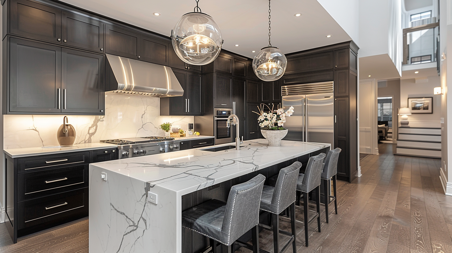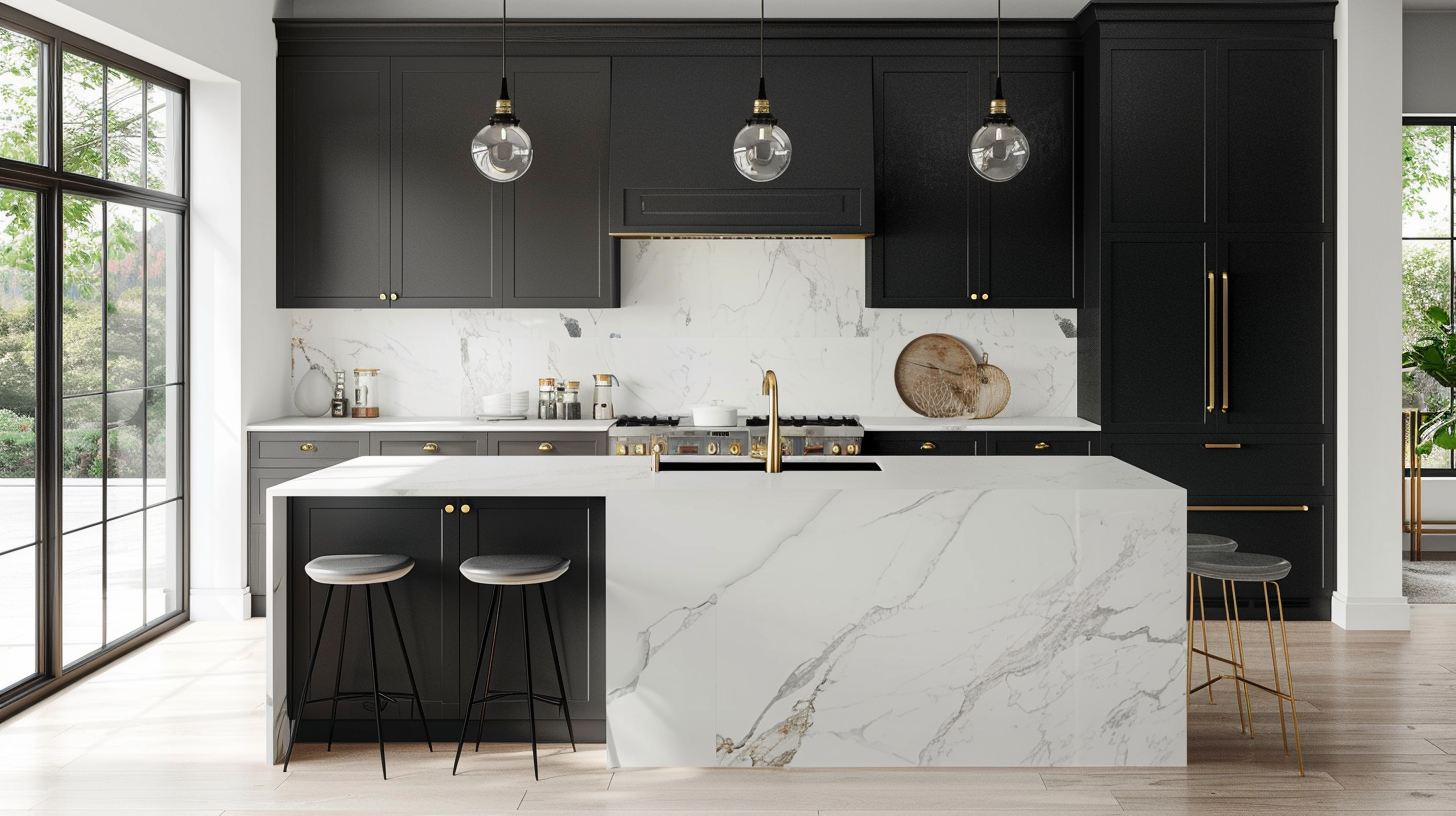 A black and white two-tone designer kitchen with a waterfall island