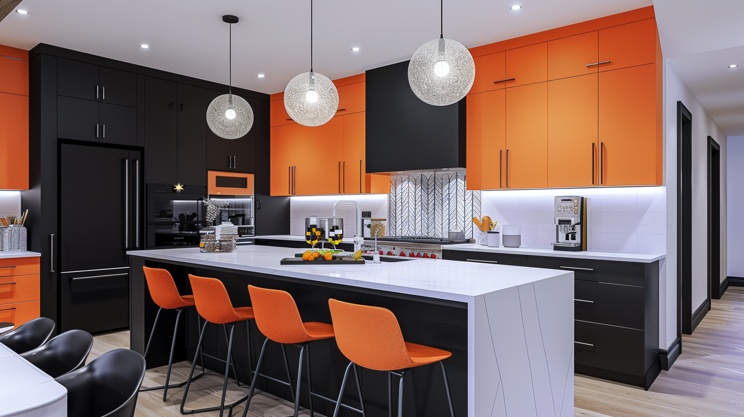 Bold colors collide! The sparkle of colliding colors makes this kitchen very appealing. The gradient fish scale porcelain tile backsplash looks very sophisticated in the light. The cabinets are a clashing design of black and orange and accented with black hardware, which makes the kitchen very dynamic and vibrant. The white solid surface countertops and white minimalist pendant lights stand out in this kitchen. The kitchen island is equipped with chairs where you can enjoy a wonderful meal with your family. The appliances are not fully recessed into the cabinets but are slightly raised, which gives the whole kitchen a sense of space and layers.