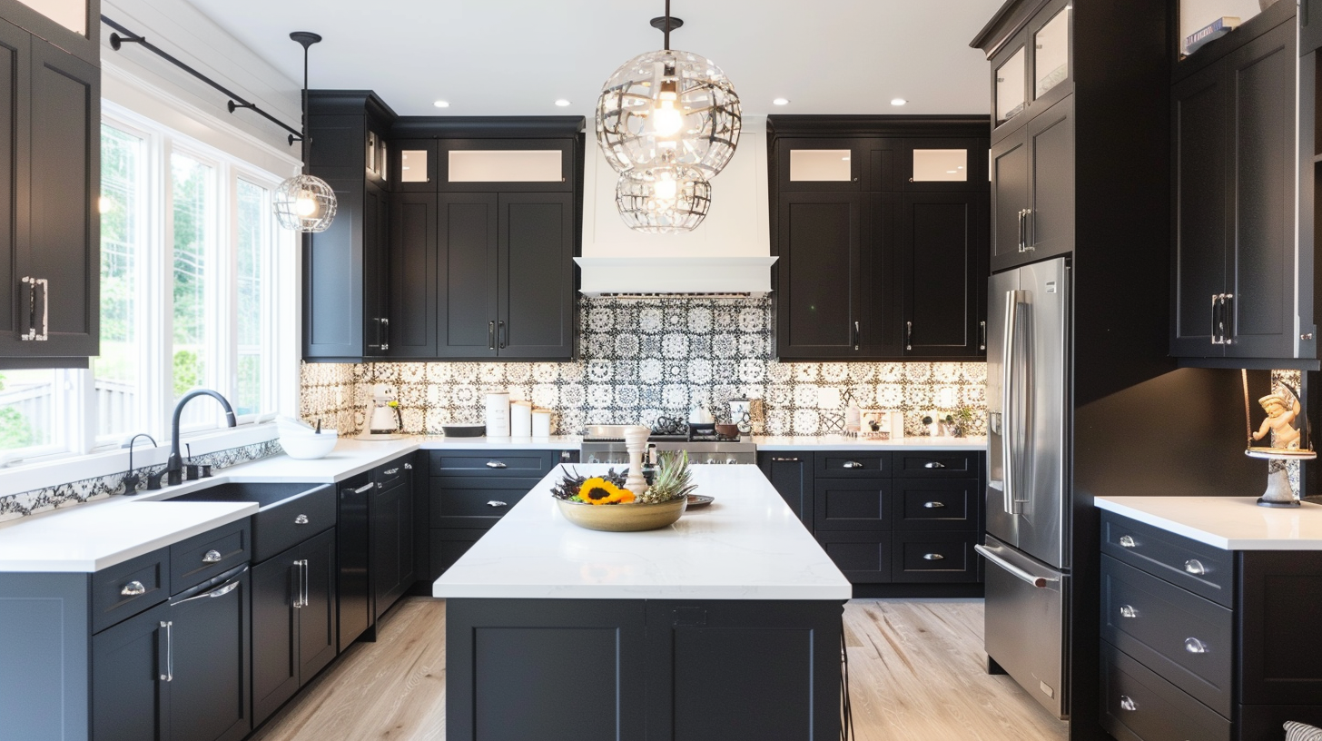 Contemporary black matte kitchen with cement tile backsplash