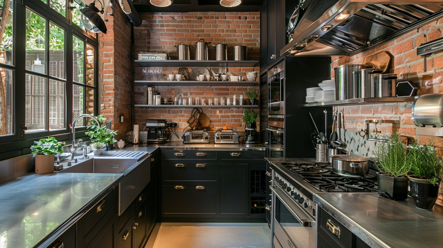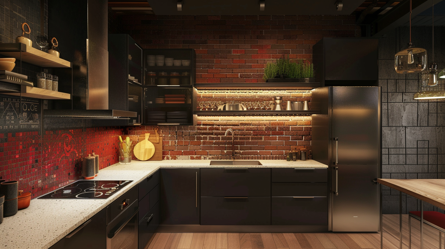 Unique black industrial kitchen with red stone tile backsplash