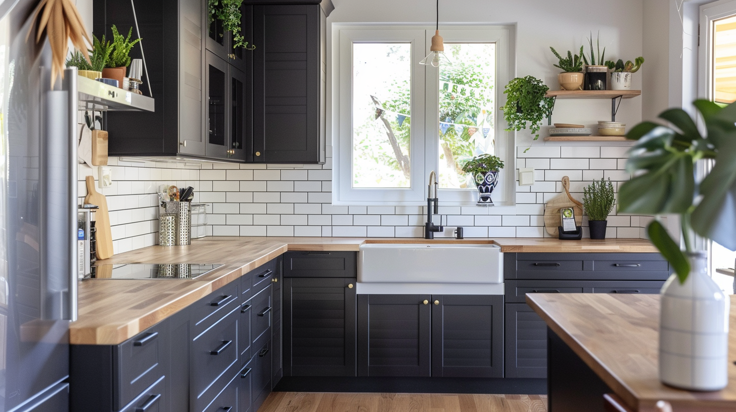 In this L-shaped farmhouse style matte black kitchen, the beige subway tile backsplash is laid through to the ceiling, emphasizing the height of the kitchen and making it look more spacious, with a white sliding window to give your kitchen a warm home-like atmosphere. The cantilevered island features a solid wood countertop that is very warm to the touch and paired with greenery for a more nature-fresh atmosphere. The farmhouse style sink complements the mid-tone wood flooring. The built-in panel cabinets are as stylish as they can be.