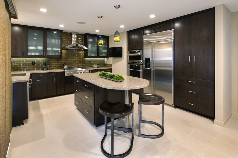 The large U-shaped transitional kitchen is very attractive. The matte black flat panel cabinets feature chrome handles for a very sophisticated look. The island has a rounded shape on one side, which nicely breaks up the mostly vertical lines in the kitchen and gives it more variety. It is also very practical. The green tile backsplash is arranged horizontally and flat, bringing life and vitality to the kitchen. The glass upper cabinets and stainless steel appliances are very simple in design, which prevents a crowded look while illuminating the kitchen and making it more open.