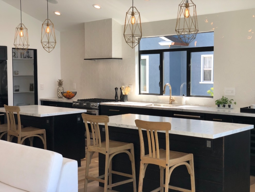 In this farmhouse kitchen, solid wood chairs and flooring provide you with a comfortable kitchen experience. The matte black shaker cabinets with simple linear pendant lights brings out a unique feel to this kitchen, which is a perfect combination of elegance and simplicity. The double island is symmetrically distributed, and the luxury it brings to the entire kitchen takes it to the next level. The undermount sink, golden gooseneck faucet and marble countertop reflect each other and look very stylish under the natural light. The white ceramic backsplash provides a clean and bright backdrop to the kitchen, and everything is perfect.