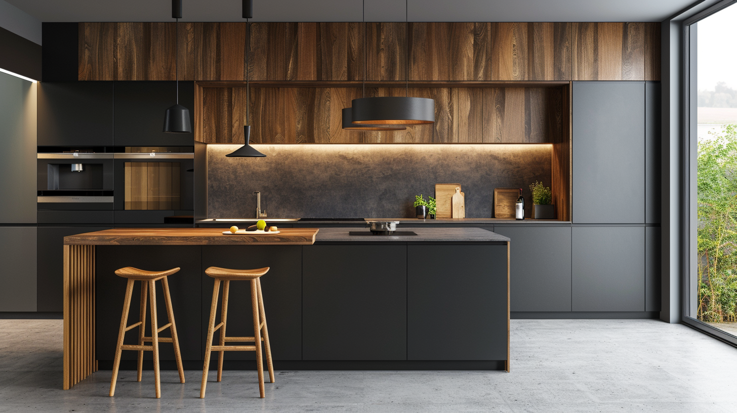 A very artistic black matte and wood veneer kitchen