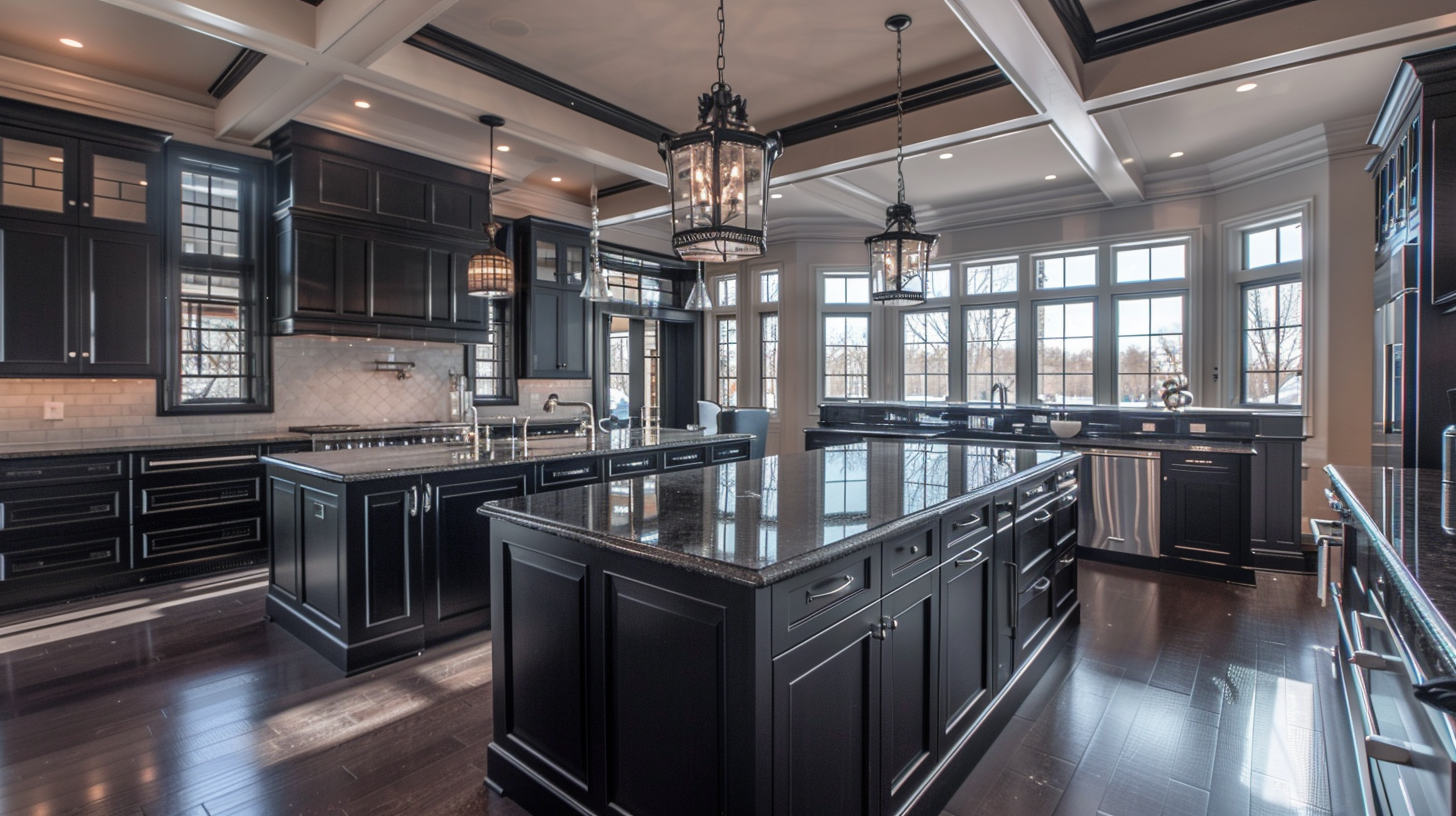 Matte Black Kitchen Cabinets With Two Islands