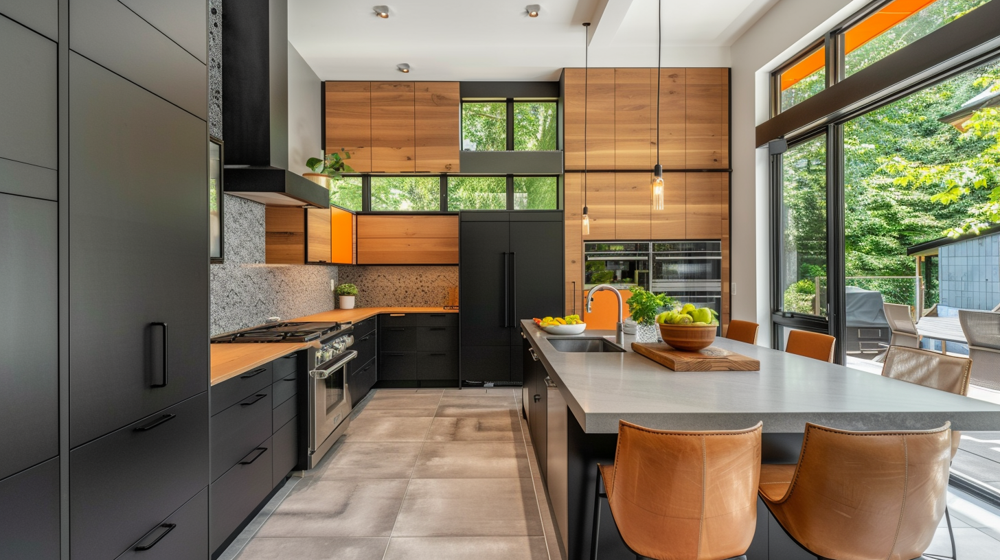Each kitchen inspiration is very impressive in this medium-sized contemporary L-shaped kitchen. The cement tile floor adds a modern industrial touch to the kitchen. The chairs are of the same shade and are very harmonious. The cabinet doors are flat panel design, which doesn’t look too monotonous, but very consistent with the idea that simplicity is best in contemporary style. The quartzite countertop, stone tile backsplash is full of natural atmosphere. Matte black cabinets and light wood cabinets complement each other, creating a balance of colors. The orange window frame adds a highlight to the kitchen and is very stylish.