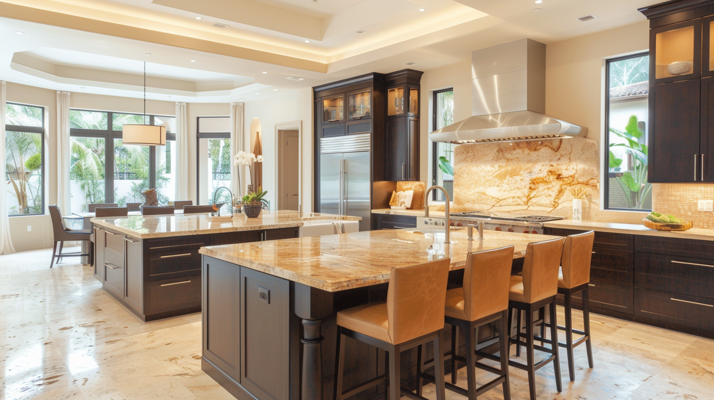 Simplicity yet elegance are the most prominent features of this contemporary kitchen. Two distinctive matte black freestanding kitchen islands contrast with the cream colored walls and vent hoods, making the kitchen rich in color and design. The brown leather high stools are also very noticeable and are very warm and comfortable to sit on. The limestone flooring, double bowl sink and beige backsplash are stylish yet minimalist. The most noteworthy part is the onyx countertop that makes the whole kitchen very luxurious.