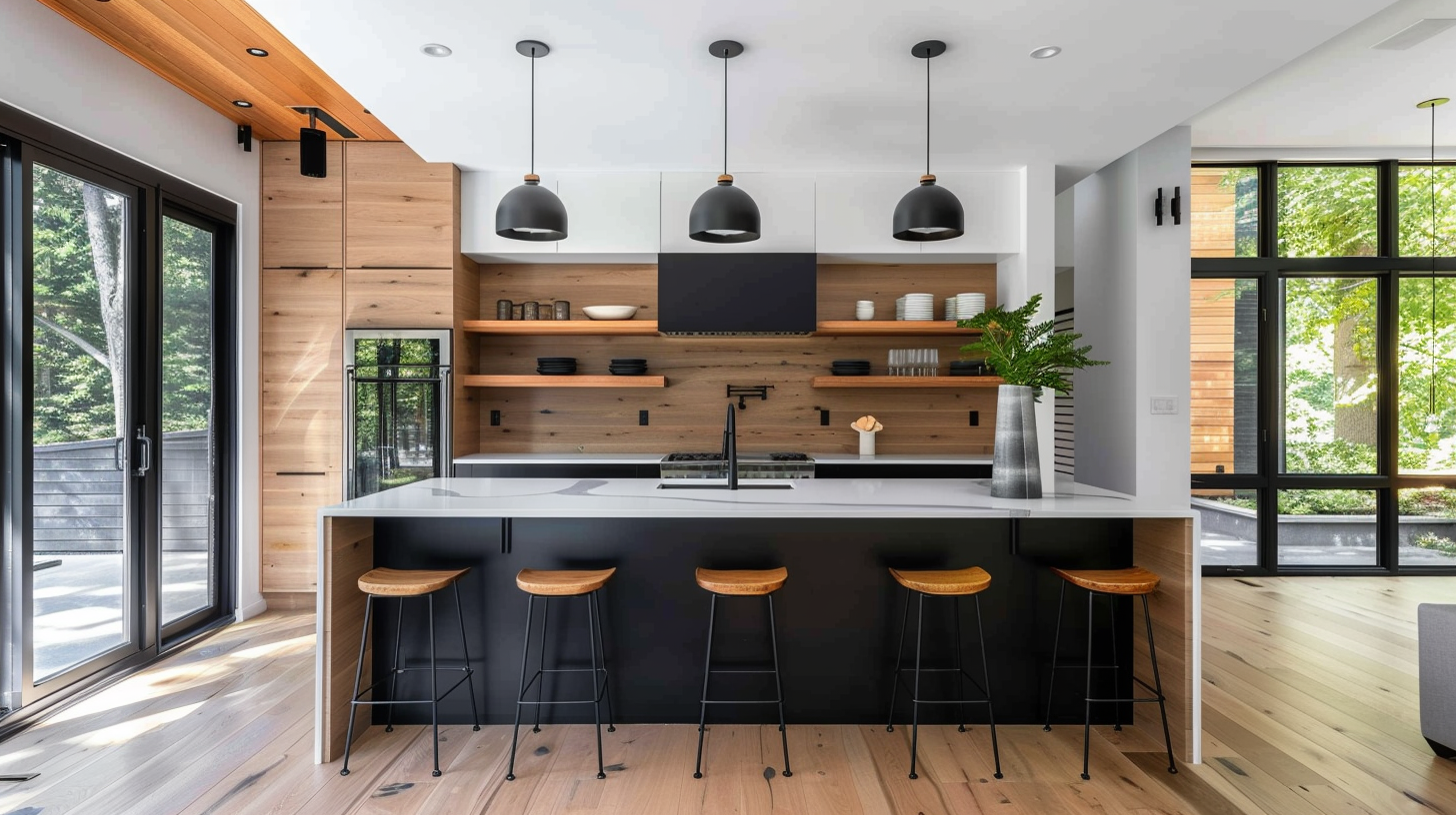 Layered modern kitchen with wood color elements