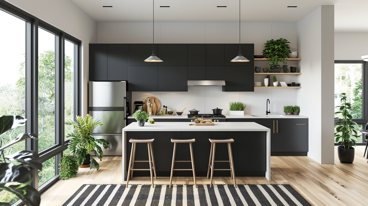 In this modern Scandinavian kitchen, the ebony matte black cabinets and white quartzite countertops are appealing for their color contrast, and the cantilevered island provides a convenient dining space. Three identical windows provide light that shines on the medium-toned wood floors, and with greenery everywhere, this kitchen looks warmer. The stainless steel exterior of the appliances and white undermount sink add a modern touch that is minimalist and very stylish at the same time. The striped rug on the wood floor creates a dynamic feel to the kitchen, while the open suspended wood shelves with your favorite items look like a work of art.