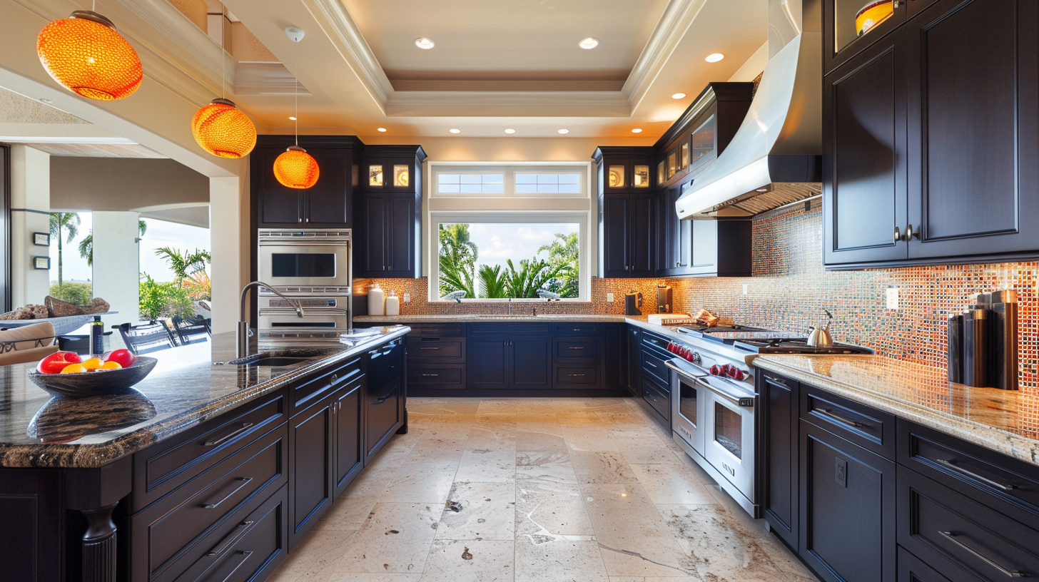 The travertine flooring has a timeless appeal in this large U-shaped open kitchen. Lantern-style pendant lights adorn this kitchen in a special way and bring light. Built-in appliances and black shaker cabinets create a unified, continuous look. The colorful mosaic backsplash adds interest and makes the kitchen look less monotonous. White sliding windows blend into this kitchen in a stylish way, taking the chill out of black and bringing warmth to the atmosphere.