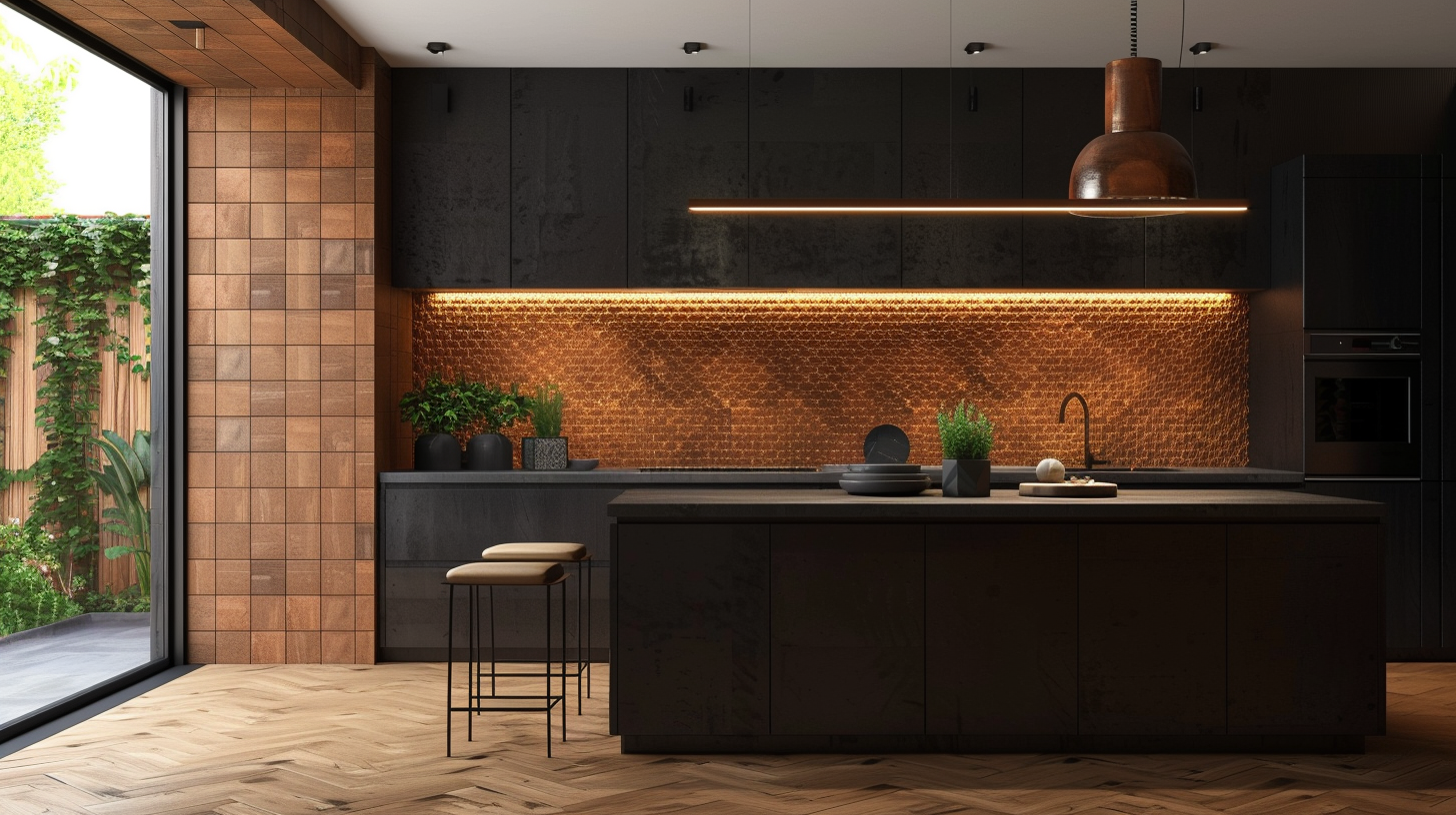 Modern black kitchen with geometric elements terracotta backsplash