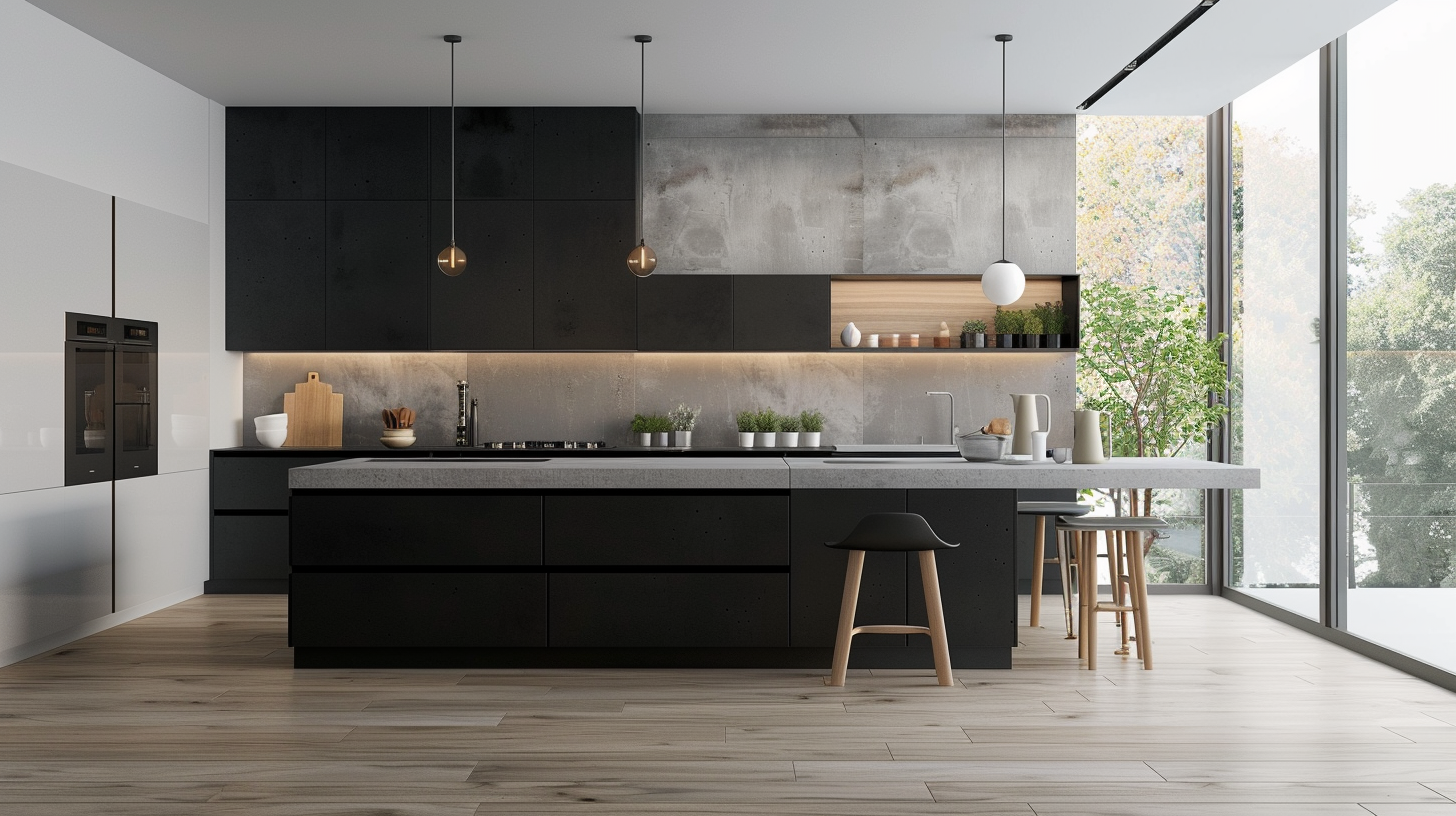 Contemporary black matte kitchen with concrete countertop