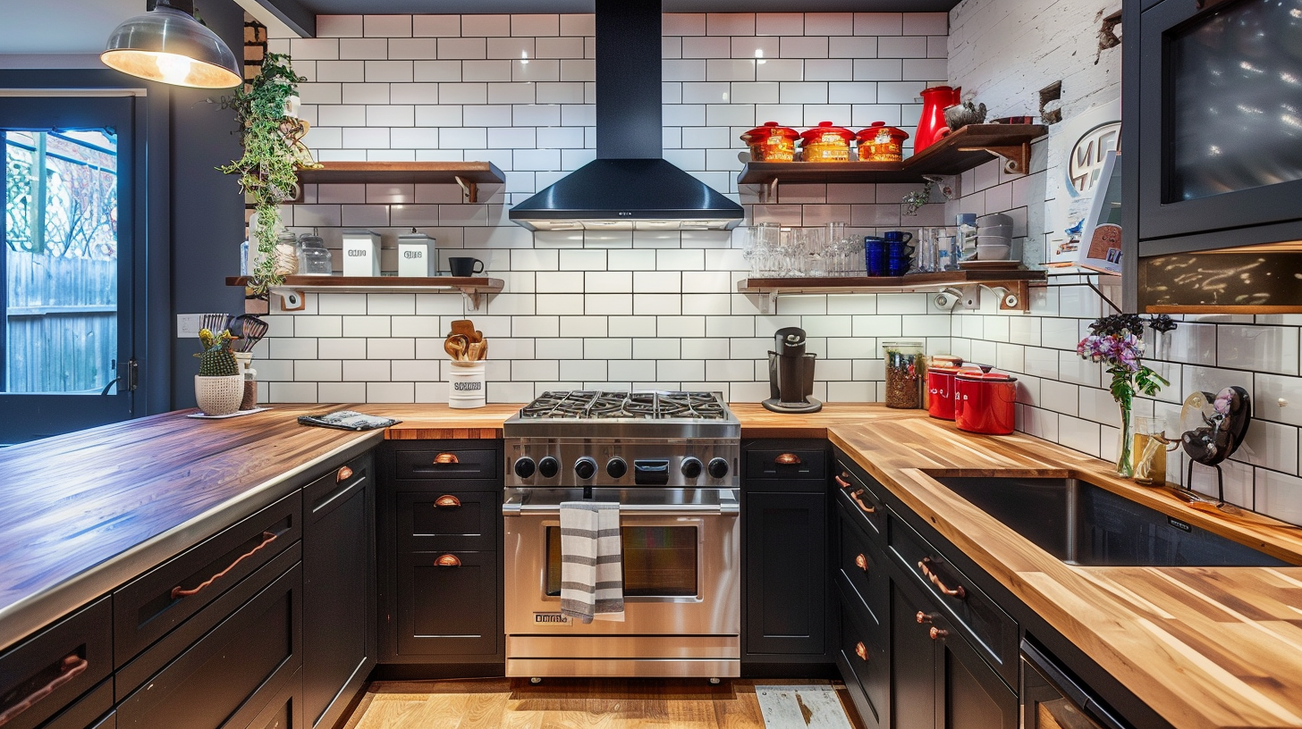 Modern industrial style black kitchen with butcher block wood countertop