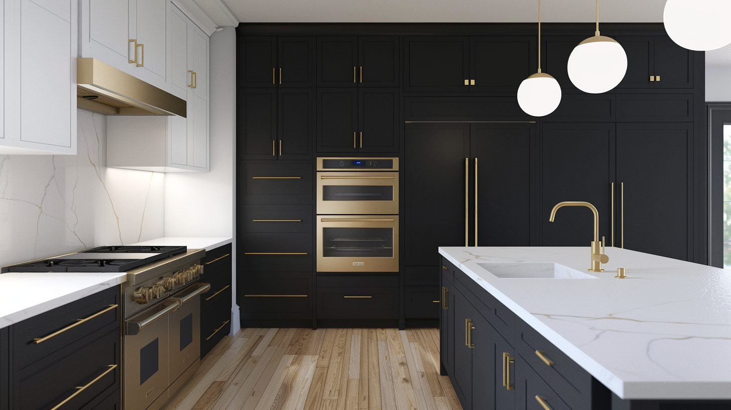 The perfect combination of classic white and classic black creates this modern kitchen. Matte black is the main color of the kitchen, but it is balanced by the presence of oak floors, white quartz countertops. The kitchen does not look overwhelming. Instead, the classic minimalist flat panel cabinets are accented by brass bar pulls, giving the whole kitchen a very noble and elegant look. The minimalist design of the spherical pendant light provides light that is reflected by the polished countertop, making the kitchen look more spacious and airy.