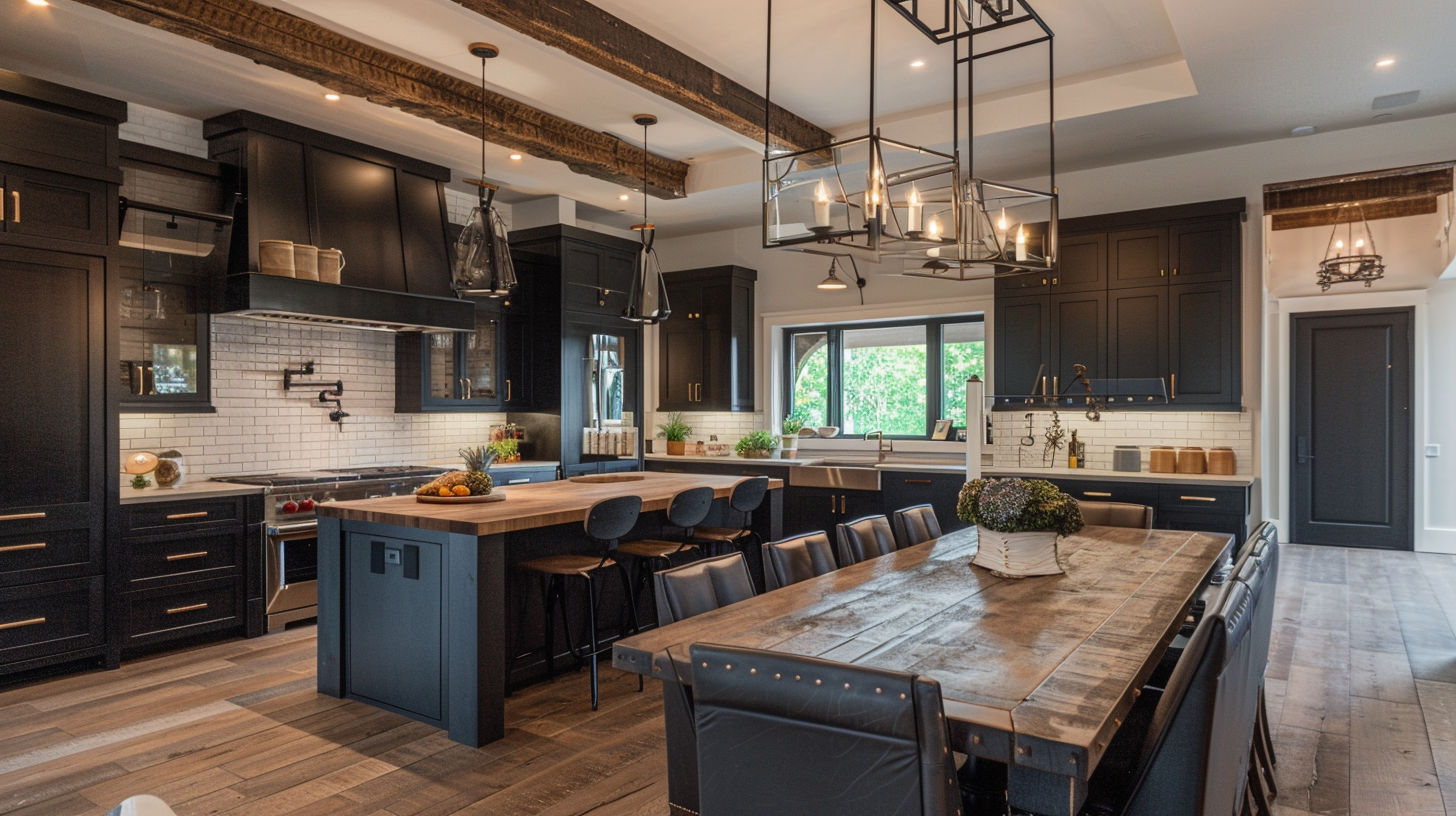 In this large rustic country kitchen, the matte black raised panel cabinets are a handleless design that contrasts with the lighter shade of the ceramic backsplash. The dark walnut table tones perfectly harmonize the entire kitchen, and the soft, warm touch of the gray solid wood flooring makes you feel comfortable and warm in this dark kitchen as well. The chandelier design is unique, and the light spills evenly over the table. The exposed beams also bring a natural atmosphere to the whole kitchen.