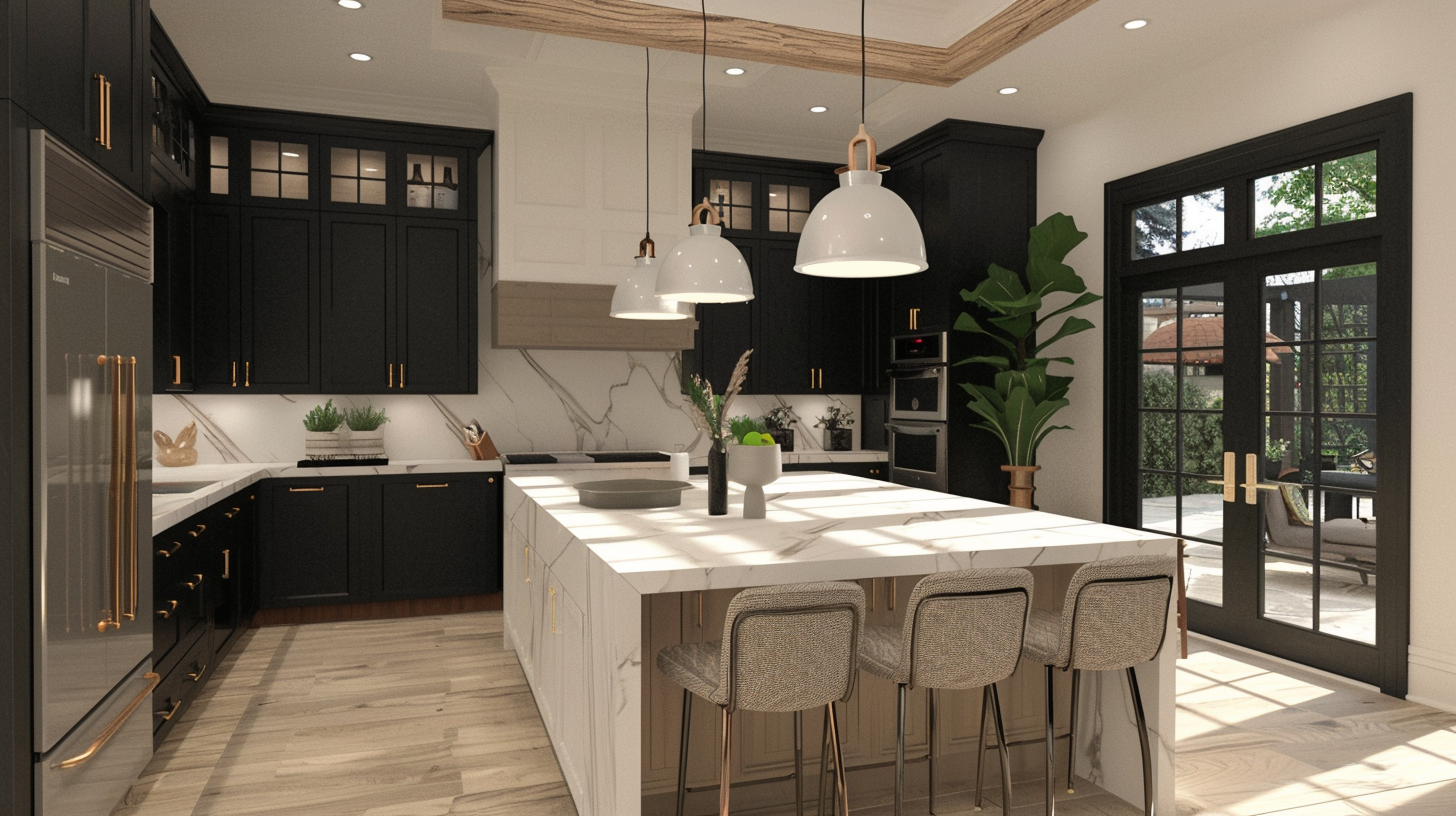 You will be absolutely stunned by the transitional style of this kitchen. the Waterfall beige center island occupies the middle of the kitchen and the pattern on it makes the whole kitchen dynamic and very sophisticated. The matte black cabinets are very special, and the four corners of the shaker cabinets are each embellished in a very striking way. At the same time, copper appliance pulls and cabinets complement each other. The beige backsplash features the same pattern as the island, ensuring the unity and harmony of the kitchen. The minimalist streamlined pendant light fits the concept of minimalist design in modern style, while the hood is very traditional and classical. The perfect transition of the two styles gives this kitchen a unique look.