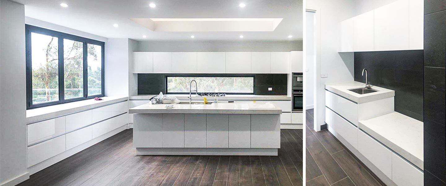 This kitchen is a very modern design, the cabinets are painted white, the hidden handles make the cabinets look neat and the kitchen looks very bright and spacious after installation.