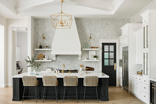 The first thing that catches the eye is the freshness of the wooden floor of this kitchen. Its texture is clear, vivid, and quite distinctive, which enriches the beauty of the kitchen. Meanwhile, the legs of the three bar stools around the island are therefore in the same color scheme to achieve a perfectly harmonious appearance. A glossy white herringbone backsplash accentuates the white kitchen cabinets with its bright finish while complementing the black island for a fresh touch. As a final point, as an embellishment, the brass-colored pendant light adds a sense of luxury to the kitchen.